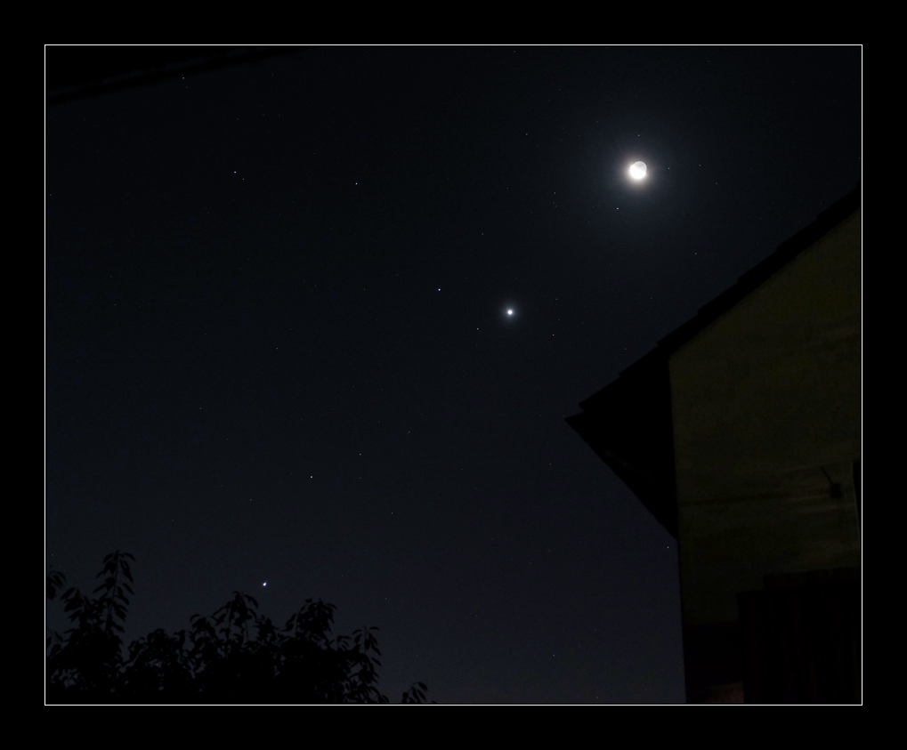 Jupiter finden Sie ganz unten knapp über dem Kirschbaum, ein kurzes Stück darüber auf 01:00-Uhr-Position der noch relativ schwache Mars. Venus steht unübersehbar als hellster Punkt unter dem Mond, dessen Sichel mit dieser Belichtung schon überstrahlt. Die restlichen Sterne gehören zum Sternbild des Löwen.