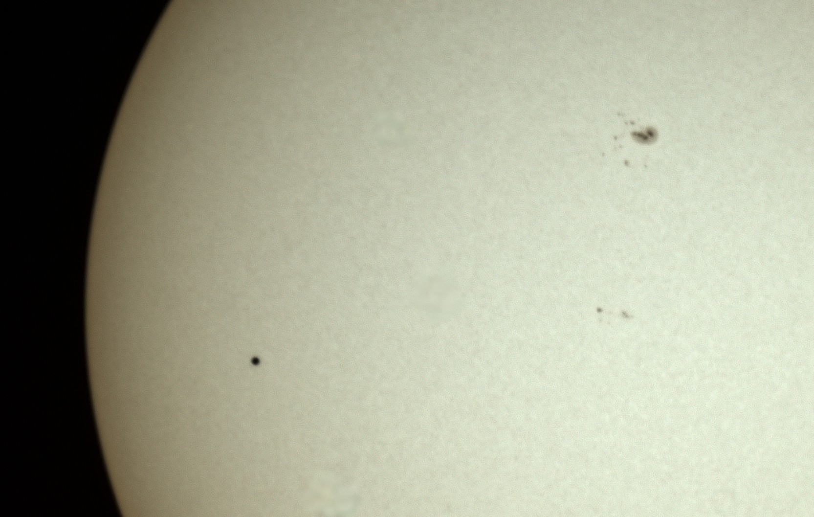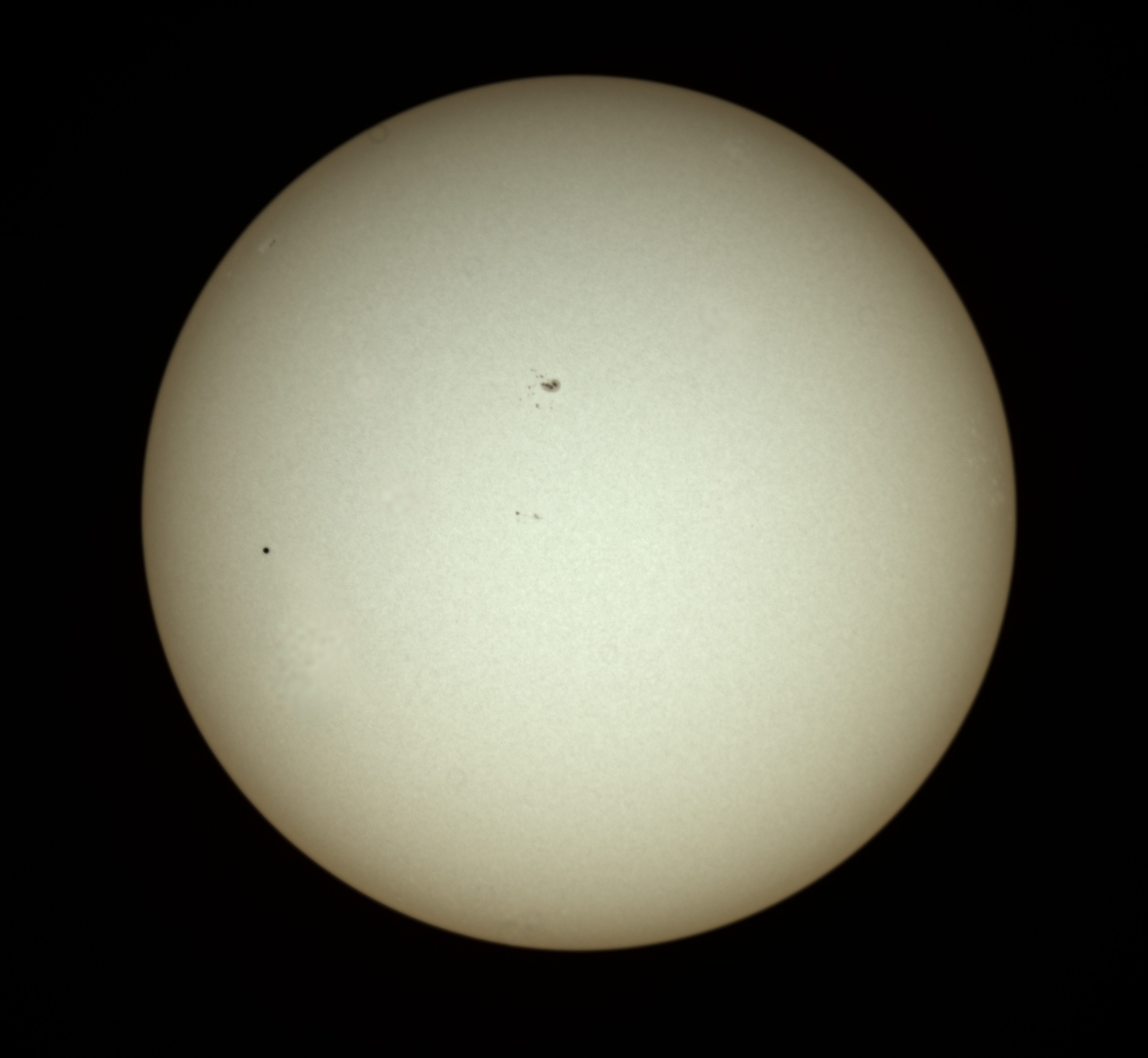 Nach den letzten drei wirklich nahezu unfassbar schönen Tagen die so mancher Astrofan durchgängig schlaflos verbracht hat, wie ich auch (einen fetten Kuss an meine Frau die so einiges mit mir erlebt hat…!) habe ich auf schönes Wetter auch für den Merkurtransit gehofft. Die Aussichten haben Wettereinschränkungen vorhergesagt. Trotzdem, das Equipment war pünktlich aufgebaut. Die Sonne war doch sehr bemüht milchig und diesig durch die Suppe durchzukommen. Immerhin war der Eintritt 13.12 Uhr deutlich wahrnehmbar und dann ging es auch mit dem Wetter bergauf. Bis 15.20 Uhr war alles o.k. Merkur ein sehr schönes, randscharfes Scheibchen, dazu einige Fleckchen auf der Sonne. Mit Baader visueller Sonnenfolie war bei ISO 400 eine Belichtungszeit bei f8 von 1/630 möglich. Beim Eintritt war es noch 1/400. Für einige Bilder habe ich auch die Serienbildfunktion meiner Sony a7II genutzt mit der Einstellung auf high. Merkur bewegt sich doch recht schnell und wenn ich Bilder stacken will sollte er nicht weiterwandern, sonst gibt’s ein Osterein auf der Sonnenscheibe.