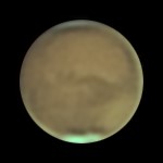 Unser Mitglied Harald Kaiser probiert es trotzdem, und ihm gelang eine sehr schöne Aufnahme des Mars in der Nacht vom 3/4.8.. Auf dem Bild sind in der Mitte die Meridiani Sinus zu erkennen, und auffällig ist die Polkappe am Südpol des Mars. Mehr Aufnahmen zum Mars und mehr findet sich in unserem Forum (nur für Mitglieder).