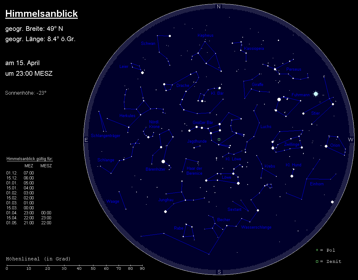 Zur Standardbeobachtungszeit (24:00 MESZ am Monatsanfang, 23:00 MESZ zur Monatsmitte und 22:00 MESZ am Monatsende) finden wir die bekannteste Sternenkonstellation, den Großen Wagen, hoch über unseren Köpfen nahezu im Zenit. Der Große Wagen ist Teil des Sternbilds Großer Bär. Eine Verlängerung der vorderen Kastensterne nach unten führt uns zum Polarstern, der stets exakt im Norden steht. Er stellt den Endpunkt der Deichsel des Kleinen Wagens dar, dem offiziellen Sternbild Kleiner Bär. Dieses hat nun fast seine maximale Höhe erreicht.