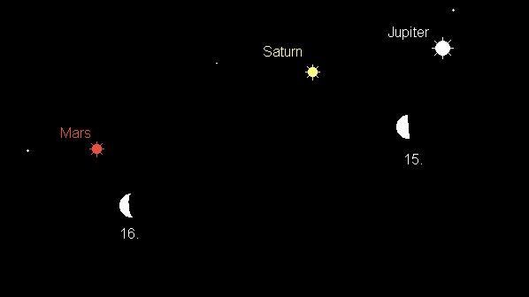 ist ein auffälliges Objekt am Morgenhimmel, nur etwa 6° östlich von Jupiter. Der 0.6m helle Ringplanet verlagert seine Aufgänge von 4:30 MESZ auf 2:45 MESZ. Man findet ihn im Sternbild Steinbock, nahe der Grenze zum Schütze. Am 15. April befindet sich der Mond 5° rechts unterhalb des Ringplaneten. Das Saturnscheibchen zeigt einen Durchmesser von 17“, der Ring von 37“ mit einem Öffnungswinkel von 20°.