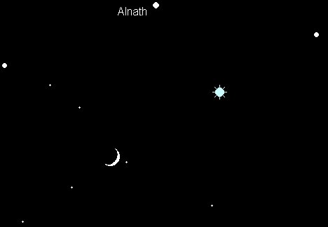 erreicht in der Nacht vom 27. auf den 28. April ihre größte Helligkeit mit –4.8m. Sie ist somit das strahlende Objekt am Abendhimmel. Venus wandert während des Monats durch das Sternbild Stier. Am Abend des 3. April findet man sie am Südrand der Plejaden, am 17. April steht sie 10° oberhalb Aldebarans und am Monatsende nähert sie sich Alnath (beta Tau). Der Mond passiert unseren Nachbarplaneten am Abend des 26. April, wobei sich Venus 6° rechts oberhalb der Mondsichel befindet. Der Abendstern sinkt zu Monatsbeginn um 0:30 MESZ unter den Horizont, zur Monatsmitte um 0:45 MESZ und am Monatsende um 0:30 MESZ, was bedeutet, dass sich ihre Sichtbarkeitsperiode aufgrund der länger werdenden Tage langsam verkürzt. Während der Durchmesser der Venussichel von 26“ auf 39“ zunimmt, geht der Beleuchtungsgrad von 47% auf 25% zurück.