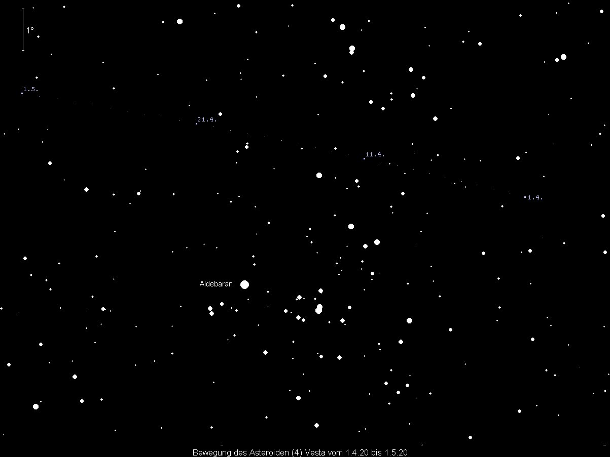 läuft Anfang April durch das Goldene Tor der Ekliptik, das von den Plejaden und Hyaden gebildet wird, und steht zur Monatsmitte 10° nördlich Aldebarans. Mit einer Helligkeit von 8.5m ist der bei Dämmerungsende bereits recht tief stehende Kleinplanet kein lohnendes Objekt mehr.