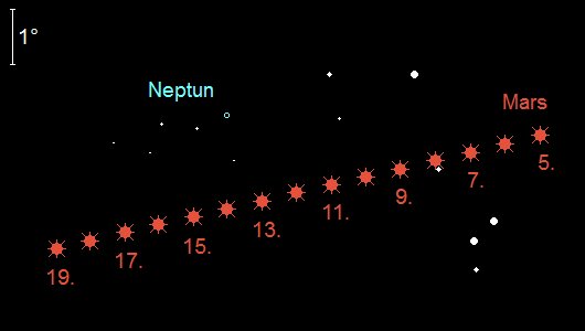 wird zu einem auffälligen Objekt der zweiten Nachthälfte. Er steigert seine Helligkeit in diesem Monat von 0.0m auf –0.5m, womit ihn nur Venus und Jupiter übertreffen. Seine Aufgänge verlagert er von 2:30 MESZ auf 1:15 MESZ. Am Morgen des 13. Juni wandert Mars nur 1.8° nördlich an Neptun vorbei – eine im Fernglas schwierig zu beobachtende Konjunktion. Am gleichen Morgen findet man den Mond 3.5° unterhalb von Mars. Am 24. Juni wechselt der Rote Planet vom Sternbild Wassermann in das Sternbild Fische. Im Teleskop zeigt sich der Planet mit einer deutlichen Phase – nur 85% des zur Erde gerichteten Planetenscheibchens sind beleuchtet. Sein Durchmesser wächst von 9“ auf 11.5“ an, so dass nun erste erfolgreiche Beobachtungen versucht werden können.