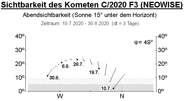 Der Komet C/2020 F3 (NEOWISE) hat sich in den vergangenen Monaten sehr positiv entwickelt und könnte, sofern er die große Sonnennähe unbeschadet übersteht, um den 10. Juli als Objekt der 1. bis 0. Größenklasse über dem abendlichen Nordhorizont auftauchen (Details in der AVKa-Schnellmitteilung Nr. 103).