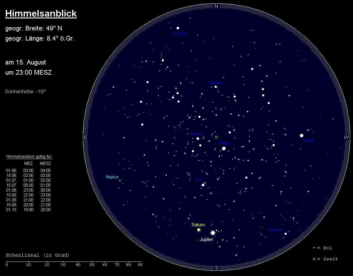 Im August ist zu den Standard-Beobachtungszeiten (24:00 MESZ zu Monatsbeginn, 23:00 MESZ zur Monatsmitte und 22:00 MESZ am Monatsende) die astronomische Dämmerung bereits beendet und somit der Sternenhimmel in seiner ganzen Pracht beobachtbar.