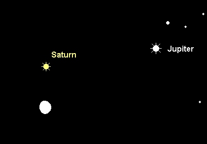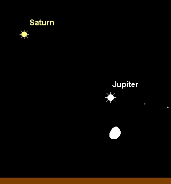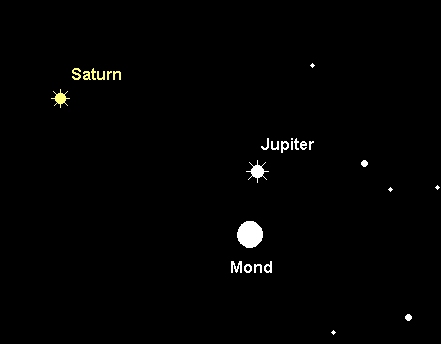 stand Mitte Juli in Opposition zur Sonne und ist weiterhin das auffälligste Objekt am Nachthimmel bis zum Aufgang der Venus. Der rückläufig im Sternbild Schütze laufende Gasplanet kann optimal beobachtet werden – sofern es die zum Horizont hin immer stärker werdende Luftunruhe zulässt. Seine Helligkeit nimmt kaum ab und beträgt zum Monatsende immer noch –2.6m. Allerdings geht der Planet zunehmend früher unter. Die Zeiten verlagern sich von 4:00 MESZ auf 2:00 MESZ. Der Durchmesser des Planetenscheibchens schrumpft nur geringfügig (zum Monatsende beträgt der Äquatordurchmesser 44.5“), so dass die atmosphärischen Bänder und Zonen, der aktuell auffällige Rote Fleck sowie die diversen Erscheinungen der Jupitermonde weiter gut beobachtet werden können. Der Mond passiert den Riesenplaneten im August gleich zweimal. In der Nacht vom 1. auf den 2. August findet man ihn 2.5°, in der Nacht vom 28. auf den 29. August 3° rechts unterhalb des Planeten.