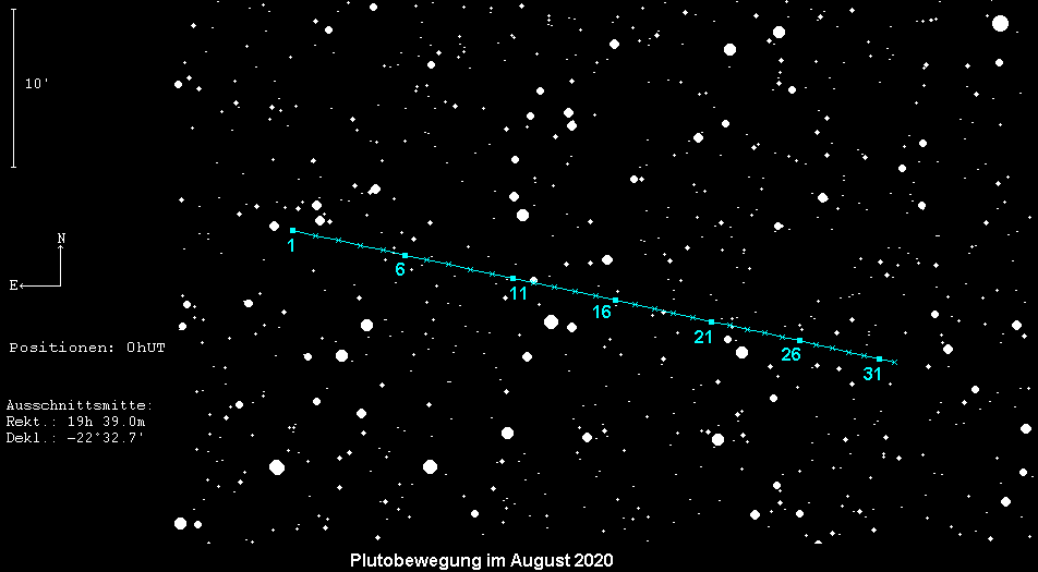 bewegt sich langsam rückläufig durch den östlichen Teil des Sternbilds Wassermann. Mit einem Fernglas kann er leidlich gut erkannt werden. Ab der Monatsmitte kann man versuchen, den 7.8m hellen Planeten bereits vor Mitternacht aufzufinden. Die beste Beobachtungszeit ergibt sich zu Monatsbeginn um 4:00 MESZ, zum Monatsende gegen 2:00 MESZ. Am Morgen des 7. August steht der Mond 6° links unterhalb des Planeten, dürfte diesen aber überstrahlen.