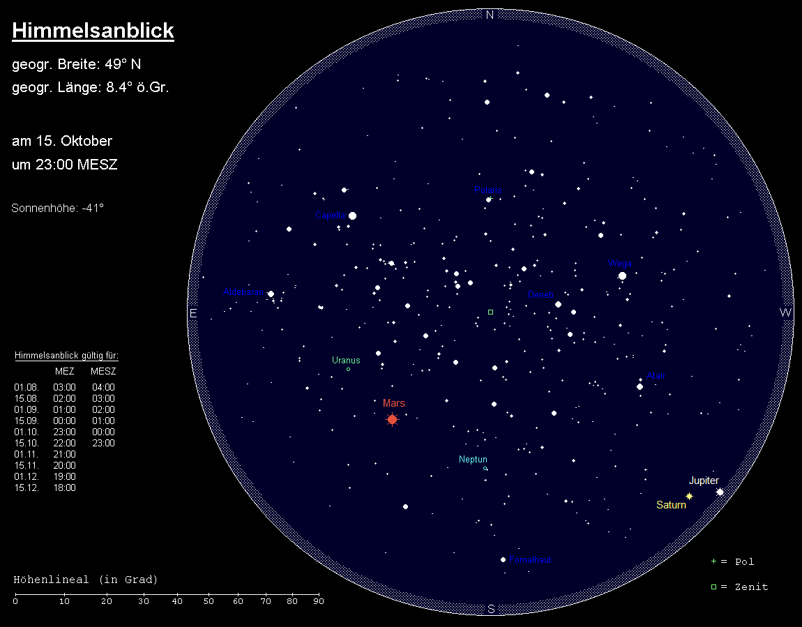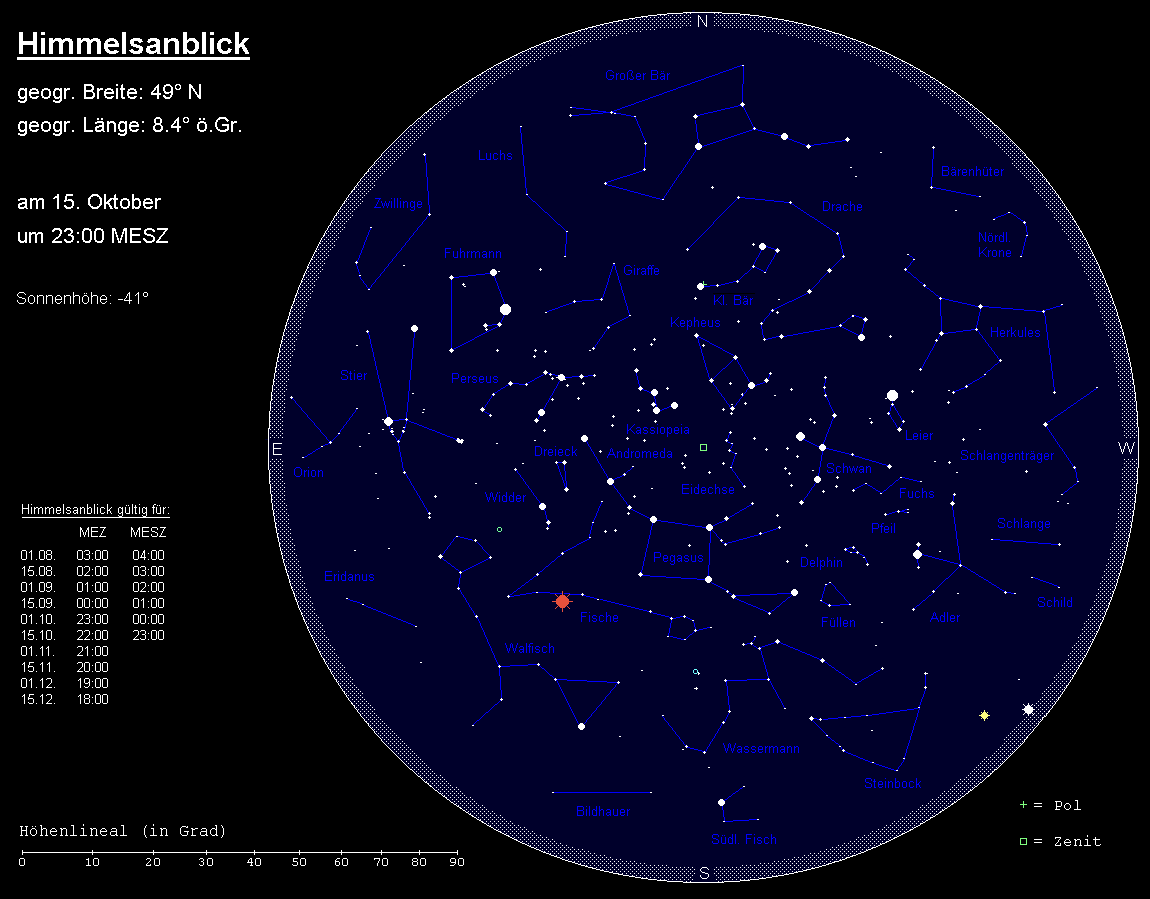 Der Südosthimmel wird von dem ausgedehnten Sternbild Walfisch eingenommen, von dem insbesondere der Stern Diphda (beta Ceti) – nicht allzu weit von Fomalhaut entfernt – auffällig ist. Östlich des Walfischs sind die ersten Sterne des Sternbilds Eridanus aufgetaucht. Über dem Walfisch ist die lichtschwache Sternenkette der Fische zu finden, von denen einzig die Sternenellipse am Westende markant ist. In diesem Herbst allerdings werden die Augen des Betrachters unwillkürlich zu diesem Sternbild gelenkt, strahlt doch in ihm der rötliche Mars in größtem Glanz. Vom Sternbild Pegasus zweigt die helle Sternenkette der Andromeda ab, und darunter findet man die kleinen, aber gut erkennbaren Sternbilder Dreieck und Widder. Am Ende der kurzen, nach Norden weisenden Sternenkette innerhalb der Andromeda finden wir den berühmten Andromedanebel, unsere Nachbargalaxie.