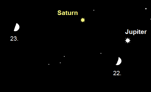 bewegt sich ebenfalls wieder rechtläufig im Sternbild Schütze und nähert sich der Grenze zum Sternbild Steinbock. Der 0.6m helle Ringplanet verlagert seine Untergänge von 0:30 MESZ auf 21:30 MEZ. Somit sollten teleskopische Beobachtungen auch beim Ringplaneten noch in der Dämmerung begonnen werden. Am Abend des 22. Oktober bildet der zunehmende Halbmond mit Saturn und Jupiter ein hübsches Dreigestirn.