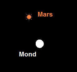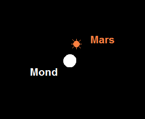 erreicht am 14. Oktober eine sehr günstige Oppositionsstellung! Der im Sternbild Fische positionierte Planet erreicht eine maximale Helligkeit von –2.7m, womit er erkennbar heller als Jupiter ist. Bis Monatsende geht die Helligkeit aber bereits wieder auf –2.2m zurück. Seinen minimalen Erdabstand von 62.1 Millionen Kilometer erreicht Mars aufgrund seiner elliptischen Bahn bereits am 6. Oktober. An diesem Tag weist das Marsscheibchen mit 22.6“ den größten scheinbaren Durchmesser auf. Mars geht bei Sonnuntergang auf und bei Sonnenaufgang unter. Beim Meridiandurchgang gegen 1:30 MESZ erreicht er Horizonthöhen von 45°. Somit lohnen sich teleskopische Beobachtungen der Albedostrukturen und der südlichen Polkappe (die allerdings sehr klein sein dürfte). Besonders eindrucksvoll sind die Gebiete Syrtis Major und Hellas. Gegebenenfalls können sogar weiße Wolken festgestellt werden, wozu ein Blaufilter hilfreich ist. Spezialisten können sich bei dieser Opposition mit einiger Aussicht auf Erfolg auf die Jagd nach dem kleinen Marsmond Deimos machen, der sich mit einer maximalen Helligkeit von 11.7m immerhin 80“ vom Marsscheibchen entfernt. Hingegen ist es eine große Kunst, den 10.7m hellen Phobos auszumachen, entfernt dieser sich doch nie mehr als 30“ vom grellen Marsscheibchen. Unser Mond passiert den strahlenden Roten Planeten im Oktober zweimal. Am Morgen des 3. Oktober finden wir den Vollmond nur 1° unterhalb von Mars und am frühen Abend des 29. Oktober 3.5° unterhalb des Roten Planeten.