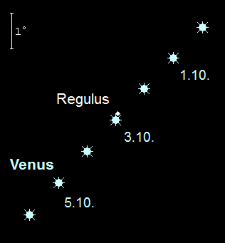 ist im Oktober einziger Planet am Morgenhimmel. Mit einer Helligkeit von –4.0m wird das Auge des Beobachters unwillkürlich zum Morgenstern hingezogen. Venus passiert den Löwenhauptstern, Regulus, am 3. Oktober, wobei ihr Abstand beim Aufgang nur 10‘ beträgt. Somit muss man schon genau hinschauen, um den 1.4m hellen Stern an diesem Morgen knapp oberhalb der Venus mit dem bloßen Auge zu erkennen. Am 22. Oktober wechselt der hellste Planet in das Sternbild Jungfrau. Venus geht zunehmend später auf, doch verkürzt sich ihre Sichtbarkeit nur wenig, da auch die Sonne immer später aufgeht. Der Planetenaufgang verlagert sich von 3:45 MESZ zu Monatsbeginn auf 4:00 MEZ am Monatsende. Die Mondsichel passiert Venus am 14. Oktober. An diesem Morgen findet man sie 4° links des Planeten. Im Teleskop präsentiert sich Venus mit einem nur noch 14“ großen, zu 75% beleuchteten Scheibchen.
