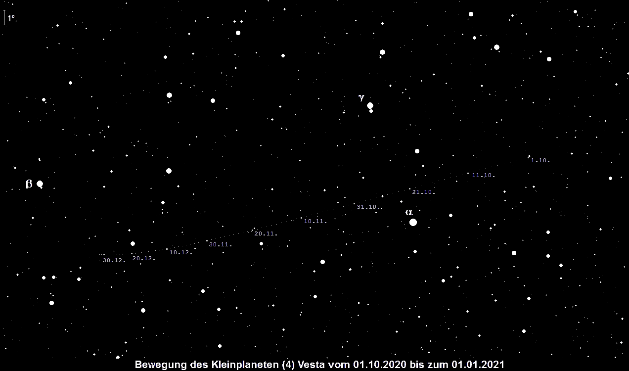 bewegt sich rechtläufig durch das Sternbild Löwe und passiert am 22. Oktober Regulus in 2.3° nördlichem Abstand. Der Kleinplanet Nr. 4 ist 8.3m hell und kann ab der Monatsmitte in einem Fernglas gefunden werden. Die beste Beobachtungszeit ergibt sich gegen 5:00 MESZ.