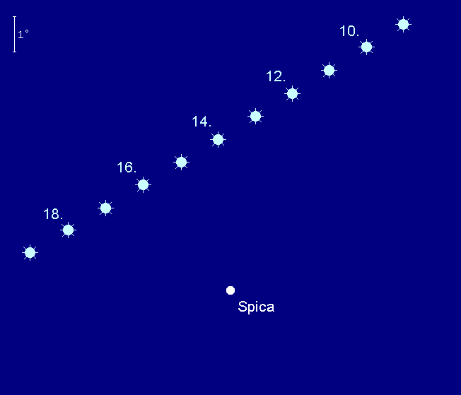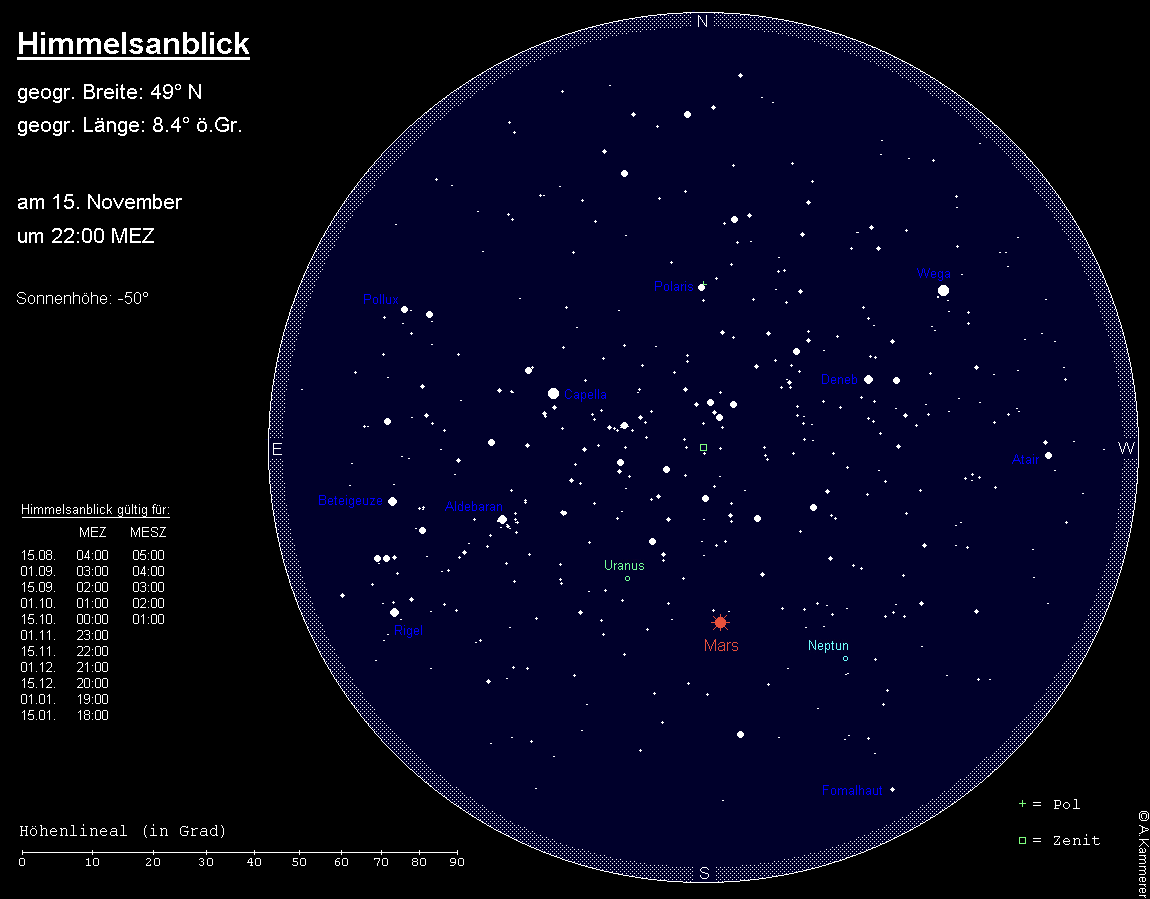 stand am 31. Oktober in Opposition zur Sonne und kann daher auch im November optimal beobachtet werden. Sein Meridiandurchgang verlagert sich im Monatsverlauf von 0:30 MEZ auf 22:30 MEZ. Der 5.7m helle Planet bewegt sich rückläufig im Sternbild Widder und ist ein einfaches Fernglasobjekt. Am 27. November steht der noch fast volle Mond 3.5° unterhalb des fernen Planeten und kann dann eventuell als Aufsuchhilfe dienen. Im Teleskop zeigt sich ab etwa 150x das 3.7“ große grünliche Scheibchen und mit Teleskopen ab etwa 25 cm Öffnung können auch die beiden größten Monde Titania (13.9m, max. Abstand: 30“) und Oberon (14.1m, max. Abstand: 40“) ausgemacht werden.