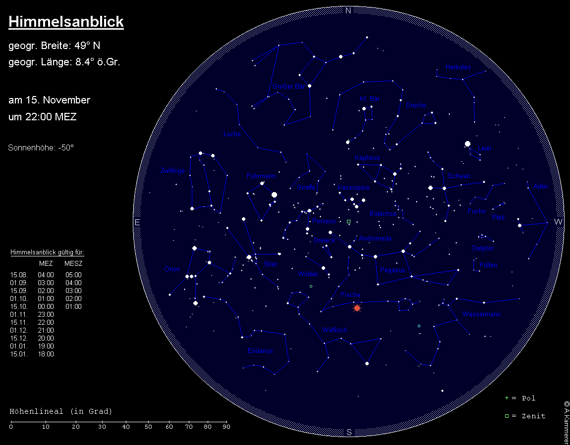 Im Süden kulminiert das große Sternbild Walfisch, von dem nur der südliche Stern Diphda und der Kopf auffälliger sind. Oberhalb des Walfischs stehen die Sternbilder Widder und Dreieck.
