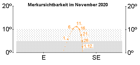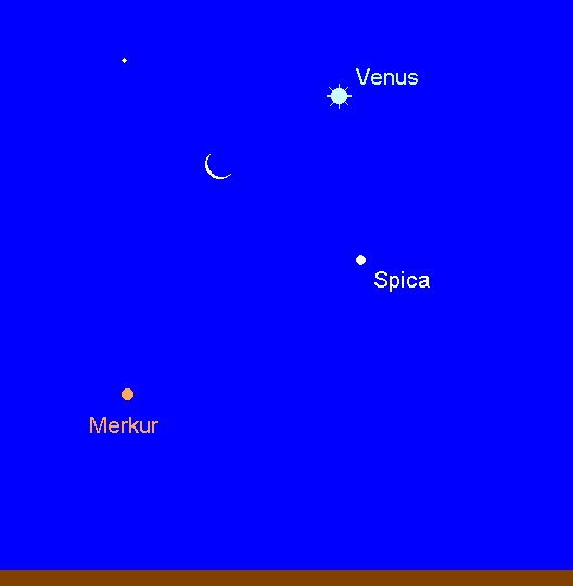 bietet im November die beste Morgensichtbarkeit des Jahres. Erstmals kann er möglicherweise bereits am 2. November als 1.0m helles Objekt tief über dem OSO-Horizont gegen 6:30 MEZ ausgemacht werden. Bis zum 10. November gewinnt er rasch an Höhe und Helligkeit (–0.6m). An diesem Tag erreicht er mit 19° die größte westliche Elongation. Danach weist er eine konstante Helligkeit auf, doch nehmen die Horizonthöhen kontinuierlich ab. Letzte Sichtungen dürften kurz vor dem Monatsende gegen 7:30 MEZ gelingen. In diesem Zeitraum wandert der flinke Planet von der Spica in das Sternbild Waage. Am Morgen des 13. November steht die Mondsichel zwischen Merkur und Venus, wobei sie sich 6° oberhalb Merkurs befindet. Teleskopisch kann man sich bereits glücklich schätzen, sofern man die Merkurphase überhaupt sicher ausmachen kann. Am 5. November weist das zu einem Drittel beleuchtete Merkurscheibchen einen Durchmesser von 8“ auf, am 10. November zeigt sich das halb beleuchtete Scheibchen mit einem Durchmesser von 7“.