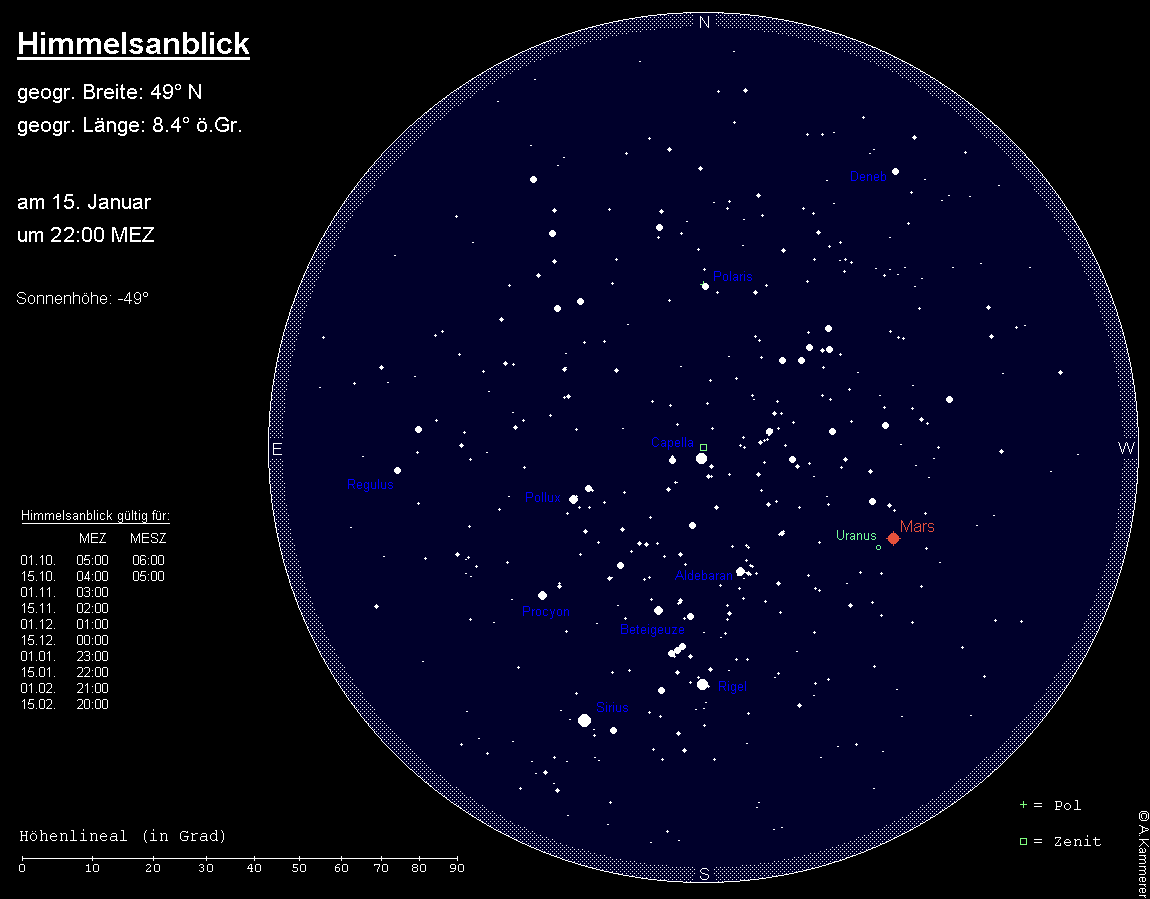 ist immer noch ein auffälliges Objekt, das zu Dämmerungsende hoch am südlichen Himmel steht. Mars zieht sich aber immer mehr vom Morgenhimmel zurück. Sein Untergang verlagert sich von 2:15 MEZ auf 1:45 MEZ. Er wandert zunächst durch das Sternbild Fische, wechselt aber am 5. Januar in das Sternbild Widder. Seine Helligkeit geht im Monatsverlauf von –0.3m auf 0.4m zurück, womit er noch immer deutlich heller als Aldebaran ist, auf den er sich zubewegt. Das Marsscheibchen schrumpft von 10.4“ auf 7.9“, so dass es schwierig wird, Albedostrukturen auszumachen. Am 21. Januar findet man den Mond 6° rechts vom Roten Planeten. Am gleichen Abend passiert Mars den schwachen Uranus in 1.6° nördlichem Abstand.