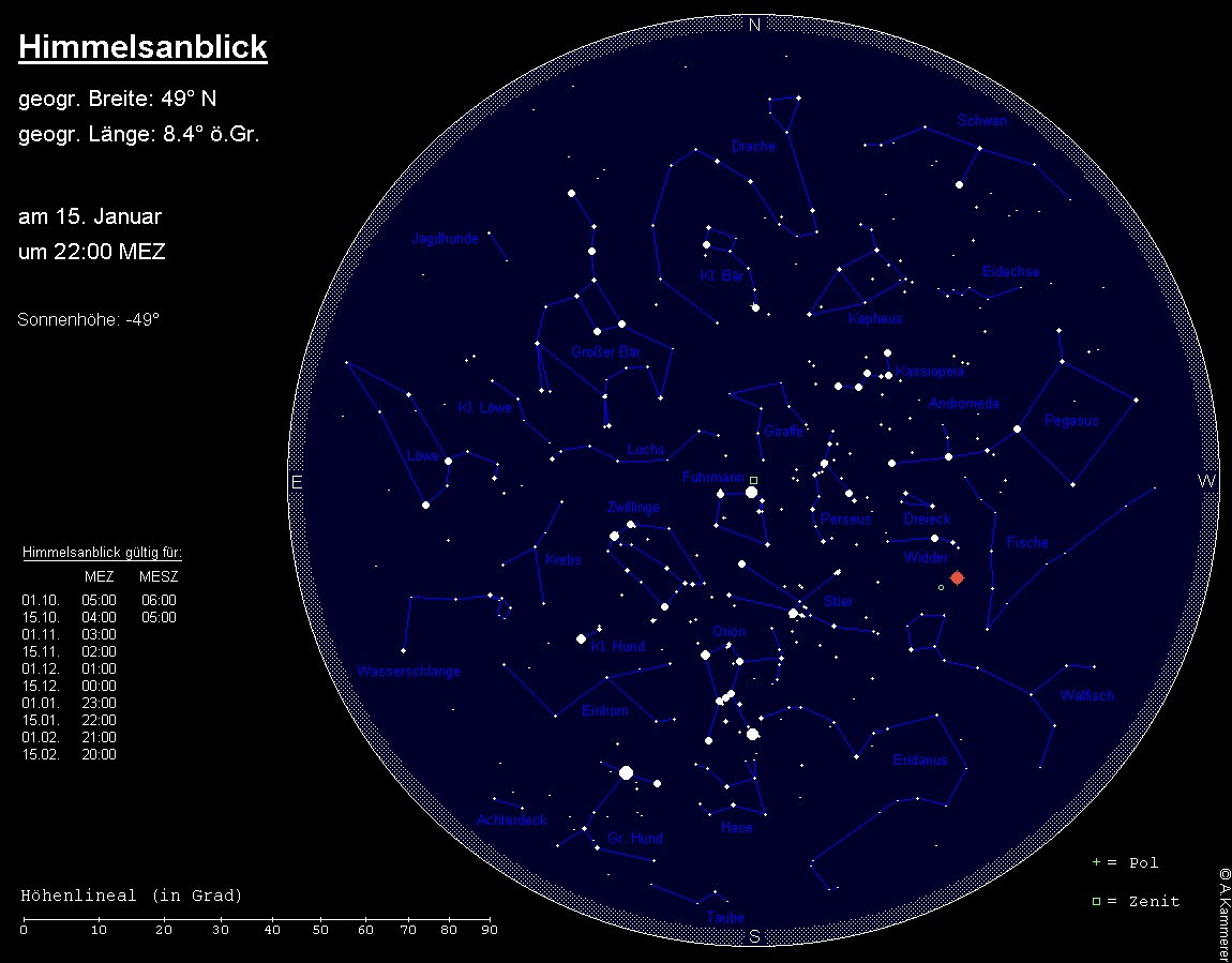 Der Helligkeitsschwerpunkt befindet sich im Januar im Süden. Halbhoch steht hier das auffälligste Wintersternbild, der Orion mit der orangefarbenen Beteigeuze und dem blauen Rigel sowie dem im Fernglas gut erkennbaren Orionnebel südlich der Gürtelsterne. Oberhalb finden wir das Sternbild Stier mit dem orangefarbenen Aldebaran und seinen zwei Sternhaufen Hyaden (um Aldebaran) und Plejaden (nordwestlich von Aldebaran), auch Siebengestirn genannt. Und über unseren Köpfen, im Zenit, steht die helle Capella, Hauptstern des Sternbilds Fuhrmann. Nordöstlich des Orions befindet sich das Sternbild Zwillinge mit Castor und Pollux und unterhalb der Zwillinge das Sternbild Kleiner Hund mit dem hellen Procyon. Südöstlich des Orions strahlt Sirius im Sternbild Großer Hund, der hellste Stern am irdischen Himmel. Das Wintersechseck, gebildet aus den Sternen Capella, Pollux, Procyon, Sirius, Rigel und Aldebaran, zieht somit im Süden alle Blicke auf sich.