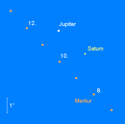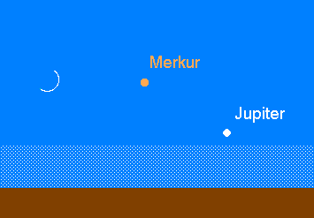 kann ab etwa dem 10. Januar tief über dem WSW-Horizont gesichtet werden. Spezialisten können bereits am 9. Januar gegen 17:30 MEZ einen ersten Versuch unternehmen. An diesem Tag steht der –0.9m helle Planet nur 1.7° von Saturn entfernt, der aber nur noch im Fernglas ausgemacht werden kann. Am folgenden Abend findet man ihn 1.5° links unterhalb des deutlich helleren Jupiters, doch wird auch dabei ein Fernglas sicher hilfreich sein. Merkur geht an diesem Abend gegen 18:00 MEZ unter. Die schmale Mondsichel kann am Abend des 14. Januar bei der Merkuridentifikation behilflich sein, steht sie doch nur 4° linker Hand von Merkur. Am 24. Januar erreicht der flinke, noch immer –0.6m helle Planet seine größte östliche Elongation (die aber mit 18.5° sehr bescheiden ausfällt) und gleichzeitig die größte Horizonthöhe. Der Untergang erfolgt an diesem Tag gegen 18:45 MEZ. Bis zum Monatsende sinkt Merkur zwar nur wenig dem Horizont entgegen, doch nimmt die Helligkeit rasch ab: am 28. Januar beträgt sie 0.0m und am 31. Januar nur noch 0.9m. Am 30. Januar wird Merkur rückläufig und eilt der Sonne entgegen. Teleskopische Beobachtungen dürften sehr schwierig sein. Am 25. Januar zeigt sich das halb beleuchtete Scheibchen lediglich mit einem Durchmesser von 7.2“.
