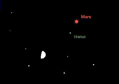 wird am 14. Januar stationär und wandert anschließend wieder rechtläufig durch den südwestlichen Teil des Sternbilds Widder. Am besten beobachtbar ist Uranus nahe der Meridianpassage, die zu Monatsbeginn um 20:00 MEZ stattfindet, am Monatsende bereits um 18:00 MEZ. Der 5.8m helle Planet geht anfangs gegen 3:00 MEZ, am Monatsende gegen 1:00 MEZ unter. Am 21. Januar passiert Mars den fernen Planeten in 1.6° nördlichem Abstand. Am gleichen Abend steht der Mond 5° links unterhalb des Planeten.