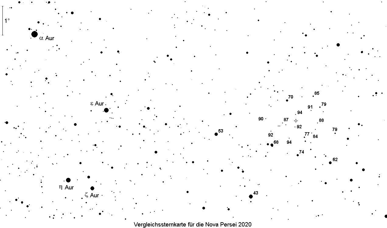 Im Sternbild Perseus ist eine Nova explodiert. Am 28. November 2020 betrug ihre Helligkeit 8.5m, so dass sie selbst in einem Fernglas erkennbar war. Die weitere Entwicklung ist bei einer Nova schwer vorhersehbar. Es ist möglich, dass sie bereits ihre Maximalhelligkeit erreicht hat, doch könnte sie auch noch etwas heller werden. Beobachtungen sind dringend erwünscht. Weitere Details entnehme man der AVKa-Schnellmitteilung Nr. 105.