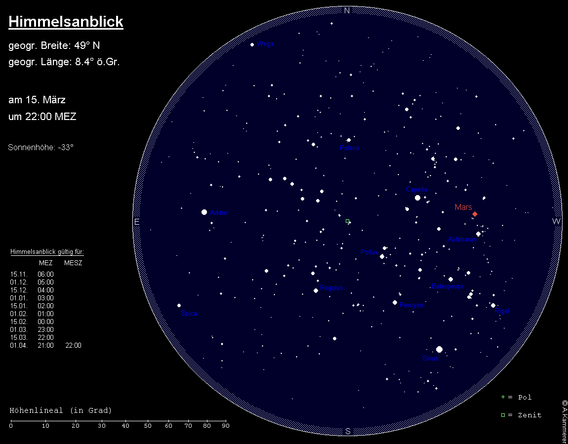 wandert in der ersten Märzwoche durch das Goldene Tor der Ekliptik, wie die Region zwischen Plejaden und Hyaden genannt wird. Am 4. März steht der Rote Planet knapp 3° links unterhalb der Plejaden. Am 19. März wandert der zunehmende Mond zwischen Mars und Aldebaran hindurch, wobei sich unser Erdtrabant 2° links unterhalb von Mars befindet. Am 23. März passiert Mars Aldebaran in 7° nördlichem Abstand. Die Helligkeit des Roten Planeten nimmt weiter ab, und zwar von 0.9m auf 1.3m. Am Monatsende beträgt der Scheibchendurchmesser nur noch 5.3“, so dass teleskopische Beobachtungen nicht mehr lohnen. Die Untergänge des Planeten verschieben sich von 1:15 MEZ auf 1:45 MESZ.
