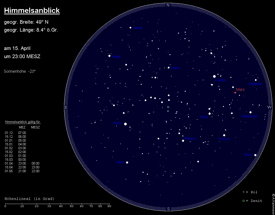 Zur Standardbeobachtungszeit (24:00 MESZ am Monatsanfang, 23:00 MESZ zur Monatsmitte und 22:00 MESZ am Monatsende) finden wir die bekannteste Sternenkonstellation, den Großen Wagen, hoch über unseren Köpfen nahezu im Zenit. Der Große Wagen ist Teil des Sternbilds Großer Bär. Eine Verlängerung der vorderen Kastensterne nach unten führt uns zum Polarstern, der stets exakt im Norden steht. Er stellt den Endpunkt der Deichsel des Kleinen Wagens dar, dem offiziellen Sternbild Kleiner Bär. Dieses hat nun fast seine maximale Höhe erreicht.