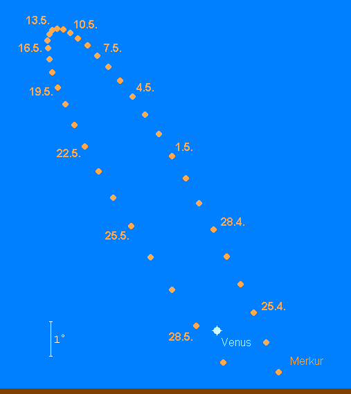 taucht in der letzten Aprilwoche tief über dem abendlichen Nordwesthorizont auf. Die –3.9m helle Venus kann gegen 21:00 MESZ aufgesucht werden. Sie steht nahe Merkur, der sie am 25. April in nur 1° nördlichem Abstand passiert und am folgenden Abend 1.5° oberhalb derselben zu finden ist. Diese Konjunktion zu beobachten dürfte selbst mit dem Fernglas schwierig sein.