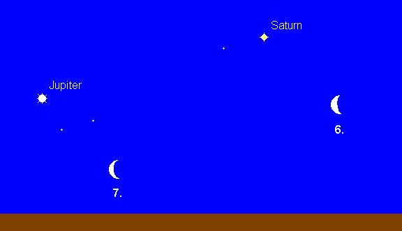 ist ein gut sichtbares Objekt am Morgenhimmel. Der –2.1m helle Gasplanet geht zu Monatsbeginn gegen 5:45 MEZ über dem Südosthorizont auf, am Monatsende gegen 4:00 MESZ. Er läuft durch das Sternbild Steinbock und tritt am 25. April in das Sternbild Wassermann. Am Morgen des 7. April befindet sich die schmale Mondsichel 6° rechts unterhalb von Jupiter. Für sinnvolle teleskopische Beobachtungen steht der Planet in diesem Monat noch zu tief.