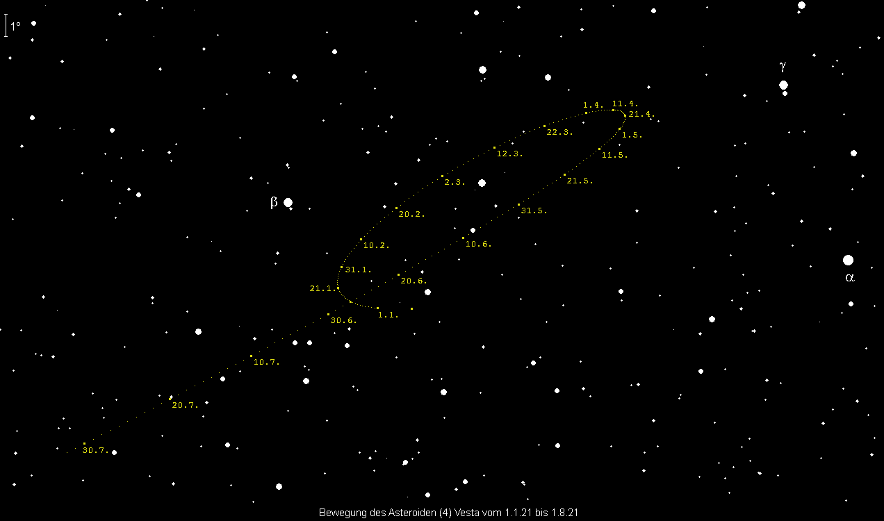 ist ein im Fernglas einfaches Objekt, das sich zunächst rückläufig durch das Sternbild Löwe bewegt. Am 22. April wird sie stationär und bewegt sich anschließend wieder rechtläufig. Ihre Helligkeit geht von 6.4m auf 7.0m zurück. Ihre Kulminationszeiten verlagern sich von 23:30 MESZ auf 21:30 MESZ.