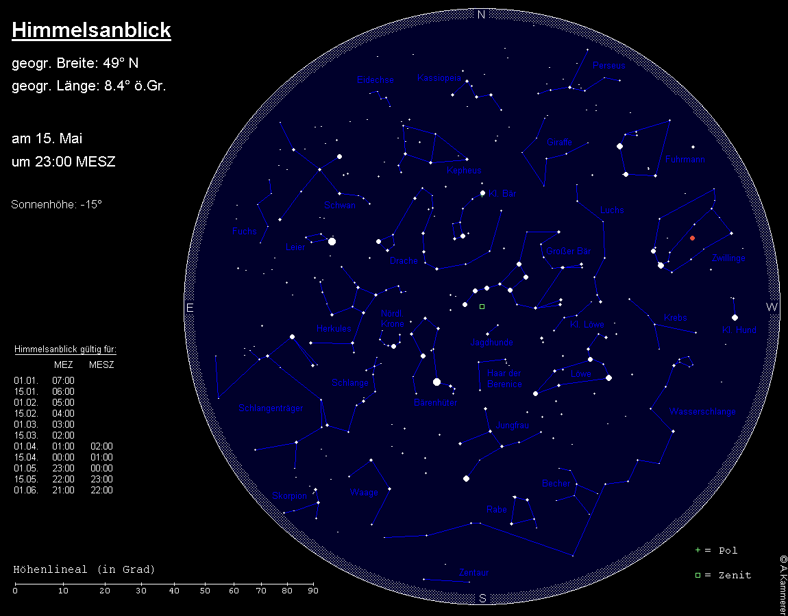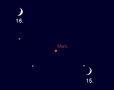 sinkt dem Nordwesthorizont immer näher. Seine Untergänge verlagern sich von 1:15 MESZ auf 0:15 MESZ, seine Helligkeit nimmt von 1.5m auf 1.7m ab. Mars ist ein recht unscheinbares Gestirn geworden. Er wandert durch das Sternbild Zwillinge und nähert sich Pollux. Am späteren Abend des 15. Mai befindet sich die Mondsichel 5° rechts unterhalb des Roten Planeten, am folgenden Abend 7° links oberhalb.