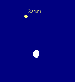 ist ein auffälliges Objekt der zweiten Nachthälfte. Der 0.6m helle Ringplanet wandert langsam durch das Sternbild Steinbock. Er geht zu Monatsbeginn gegen 3:30 MESZ, am Monatsende gegen 1:15 MESZ auf. Somit lohnen nunmehr teleskopische Beobachtungen, wobei das Planetenscheibchen einen Durchmesser von 17.1“, der um 17° zum Beobachter geneigte Ring eine maximale Ausdehnung von 38.7“ aufweist. Der Mond passiert den Ringplaneten im Mai zweifach. Am Morgen des 4. Mai (obige Darstellung) steht er 7° links unterhalb von Saturn, am 31. Mai (nachfolgende Darstellung) findet man ihn 5° unterhalb des Planeten.