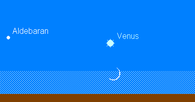 kann tief über dem Nordwesthorizont gesichtet werden, wobei sie im Monatsverlauf ein wenig an Höhe gewinnt. Am Abend des 12. Mai können Spezialisten versuchen, die schmale Mondsichel 2.5° unterhalb des Planeten zu sichten. Die –3.9m helle Venus wandert durch das Sternbild Stier, doch kann die Konjunktion mit Aldebaran (am 17. Mai im Abstand von 6°) kaum beobachtet werden. Der Untergang der Venus verlagert sich von 21:15 MESZ auf 22:30 MESZ. Am Abend des 28. Mai können Spezialisten versuchen, den schwachen Merkur nur 0.5° links der Venus auszumachen.