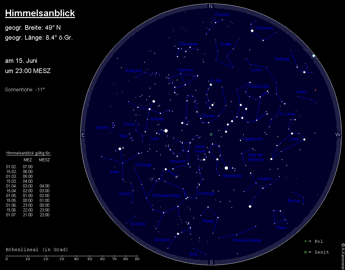 In den letzten drei Juniwochen endet die astronomische Dämmerung in Karlsruhe nicht. Zur Standardbeobachtungszeit (24:00 MESZ zu Monatsbeginn, 23:00 MESZ zur Monatsmitte und 22:00 MESZ am Monatsende) ist die Dämmerung daher nicht abgeschlossen, ja in der zweiten Junihälfte herrscht zu dieser Zeit noch helle Dämmerung, so dass schwächere Objekte entsprechend später beobachtet werden müssen. Aus Gründen der Einheitlichkeit in Bezug auf die übrigen Monate wird der Himmelsanblick aber zu jeweils den gleichen Uhrzeiten dargestellt.
