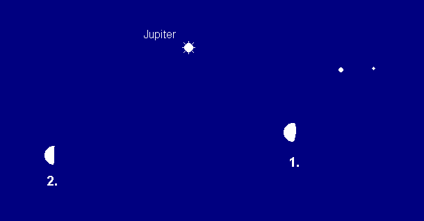 wird am 21. Juni im Sternbild Wassermann stationär und anschließend rückläufig. Damit leitet er seine Oppositionsschleife ein, was auch an der weiter zunehmenden Helligkeit erkennbar ist, die zum Monatsende –2.6m erreicht. Seine Aufgänge verlagern sich von 2:00 MESZ auf 0:00 MESZ. Der Mond passiert den größten Planeten unseres Sonnensystems im Juni zweimal. Am Morgen des 1. Juni steht der Mond 7.5° rechts unterhalb, am Morgen des 2. Juni 9° links unterhalb von Jupiter (Diagramm oben). Kurz nach Mitternacht des 29. Juni findet man den Mond schließlich 6° unterhalb des Gasplaneten (Diagramm unten). Jupiter ist ein interessantes Objekt im Teleskop. Sein Äquatordurchmesser wächst von 41.2“ auf 45.3“ an, so dass seine atmosphärischen Erscheinungen bei ruhiger Luft gut beobachtbar sind. Wie auch die wechselnden Positionen der Jupitermonde und ihre Erscheinungen wie Bedeckungen, Vorübergänge und Schattenwürfe. Hinzu kommt in diesem Jahr, dass wir auf die Bahnebene der Jupitermonde schauen und es somit zu gegenseitigen Bedeckungen und Verfinsterungen zwischen den Monden kommt. So wird am 7. Juni das Scheibchen von Europa durch Io zwischen 3:36:22 und 3:41:18 MESZ bis zu 35% seines Durchmessers verfinstert, was mit Teleskopen ab 20cm Öffnung verfolgt werden kann.