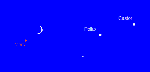 verabschiedet sich gegen Monatsende vom Abendhimmel. Der Rote Planet passiert am 2. Juni Pollux in 5° südlichem Abstand. Am 8. Juni wechselt er ins Sternbild Krebs. Mit einer Helligkeit von 1.8m ist er ein unauffälliges Objekt geworden. Am 13. Juni kann der nur 2° rechts oberhalb von Mars stehende Mond eine Identifikationshilfe sein. Mars‘ Untergänge verschieben sich von 0:15 MESZ auf 23:15 MESZ.