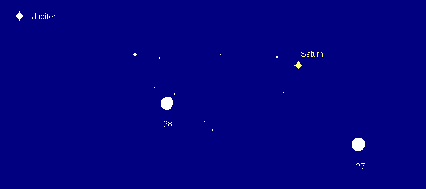 bewegt sich rückläufig durch das Sternbild Steinbock. Seine Helligkeit nimmt von 0.6m auf 0.4m zu. Der Äquatordurchmesser des Scheibchens misst Ende Juni 18.2“, der um 17° zur Erde geneigte Ring 12.3 x 41.2“. Der Ringplanet verlagert seine Aufgänge von 1:15 MESZ auf 23:15 MESZ. Am Morgen des 27. Juni befindet sich der Mond 7° rechts unterhalb von Saturn, am folgenden Morgen finden wir ihn unterhalb der Verbindungslinie zwischen Saturn und Jupiter.