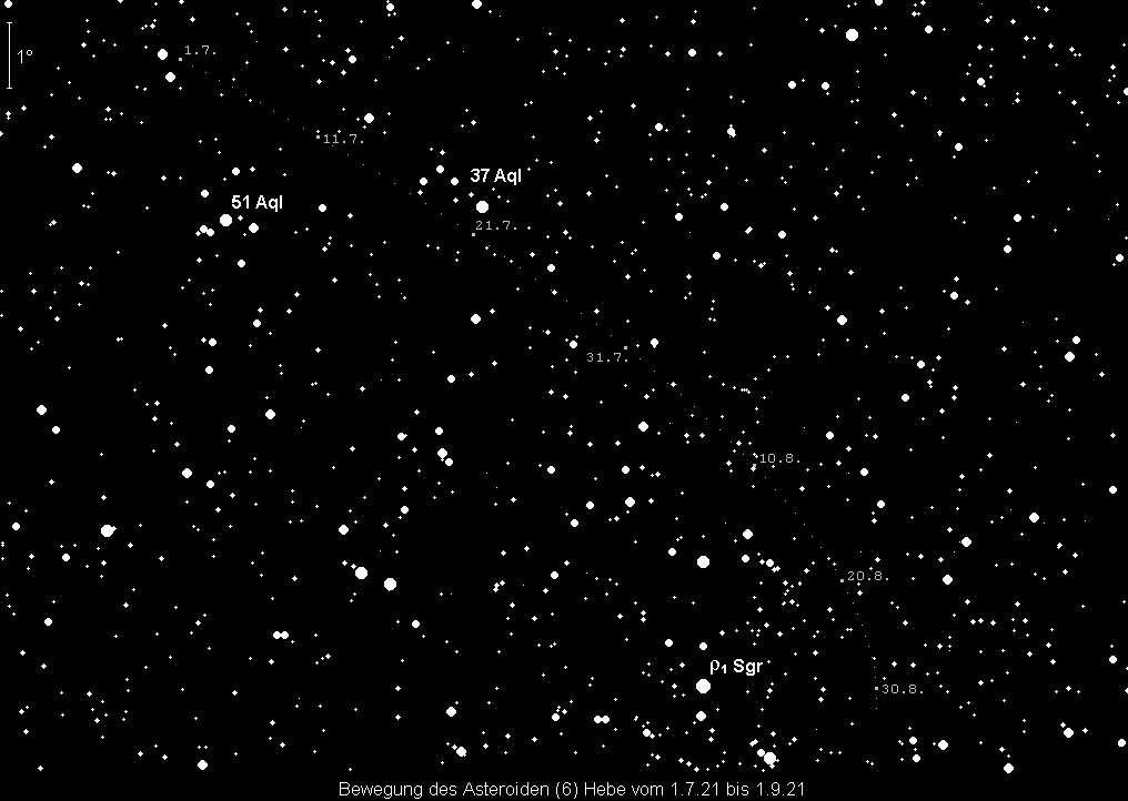 erreicht am 20. Juli ihre diesjährige Opposition. Hebe bewegt sich vom südlichen Teil des Sternbilds Adler in den nördlichen Teil des Sternbilds Schütze. Anfang Juli 8.8m hell, erreicht sie am 20. Juli eine maximale Helligkeit von 8.4m. Unter einem dunklen Himmel kann sie somit in einem guten Fernglas ausgemacht werden. Die beste Beobachtungszeit verlagert sich von 2:30 MESZ auf 0:00 MESZ.