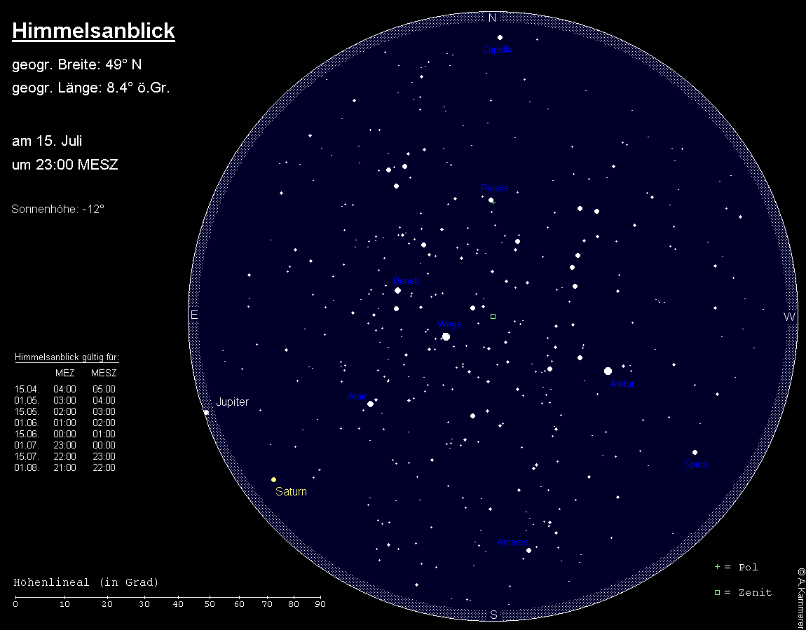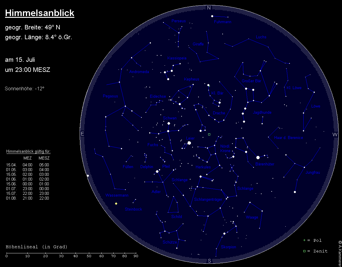 Im Juli ist die Dämmerung zur Standardbeobachtungszeit (24:00 MESZ zu Monatsbeginn, 23:00 MESZ zur Monatsmitte und 22:00 MESZ am Monatsende) noch nicht abgeschlossen, ja in der ersten Julihälfte herrscht zu dieser Zeit noch helle Dämmerung, so dass schwächere Objekte entsprechend später beobachtet werden müssen. Aus Gründen der Einheitlichkeit in Bezug auf die übrigen Monate wird der Himmelsanblick aber zu jeweils den gleichen Uhrzeiten dargestellt.