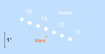 kann von Spezialisten noch in der ersten Julihälfte am dämmerigen WNW-Abendhorizont ausgemacht werden, wobei Venus eine große Hilfe ist. Der 1.8m helle Planet verschwindet zu Beginn des Monats gegen 23:00 MESZ, zur Monatsmitte gegen 22:30 MESZ und am Monatsende gegen 21:45 MESZ. Am 12. Juli befindet sich die Mondsichel 4° links oberhalb des aktuell schwachen Planeten, der an diesem Tag 0.7° links unterhalb der Venus zu finden ist. Am 13. Juli steht er 0.5° unterhalb der Venus. Damit dürfte seine Abendsichtbarkeit beendet sein. Lediglich bei extrem guter Luft können Spezialisten am 29. Juli den roten Planeten 0.7° rechts oberhalb des 1.3m hellen Regulus in einem Fernglas vielleicht noch sichten.