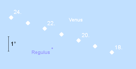 ist ein noch eher unscheinbares Objekt über dem dämmerigen WNW-Horizont. Sie verschwindet zu Monatsbeginn gegen 23:00 MESZ, am Monatsende gegen 22:15 MESZ unter dem Horizont. Am 12. Juli befindet sich die Mondsichel 4° links oberhalb der Venus. Am 13. Juli passiert der hellste Planet den aktuell unscheinbaren Mars, der 0.5° unterhalb der Venus im Fernglas erkennbar sein dürfte. Der –3.9m helle Planet tritt am 11. Juli ins Sternbild Löwe, dessen Sterne aber vor dem aufgehellten Himmel unsichtbar sind. Am 21. Juli passiert sie dessen Hauptstern Regulus 1.2° nördlich, der aber nur noch im Fernglas erkennbar sein wird.