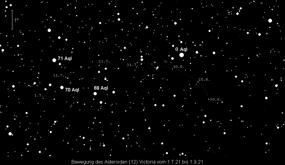 erreicht am 30. Juli eine sehr günstige Opposition im östlichen Grenzbereich des Sternbilds Adler. Ihre Helligkeit steigt im Verlauf des Julis von 9.2m auf den Maximalwert von 8.7m an, so dass sie in einem guten Fernglas erkennbar ist. Die beste Beobachtungszeit verlagert sich von 2:30 MESZ auf 1:00 MESZ.