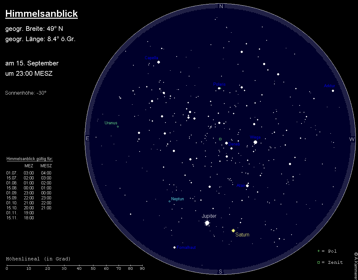 stand Ende August in Opposition zur Sonne und bewegt sich rückläufig durch das Sternbild Steinbock (nahe der Grenze zum Sternbild Wassermann). Seine monatliche Bewegung kann man anhand von delta Cap als Referenz deutlich erkennen. Jupiter ist nach dem Mond das bei weitem auffälligste Objekt am Nachthimmel, wenn auch seine Helligkeit leicht von –2.9m auf –2.7m zurückgeht. Den Mond findet man am Morgen des 18. September 7° unterhalb des Riesenplaneten, am frühen Abend des 19. September 7° links unterhalb desselben. Jupiter zieht sich langsam vom Morgenhimmel zurück. Sein Untergang verlagert sich im Verlauf des Monats von 5:15 MESZ auf 3:15 MESZ. Im Teleskop können weiterhin die sich ständig verändernden Wolkenstrukturen und das Wechselspiel der vier hellen Jupitermonde beobachtet werden. Besonders interessant ist dieses Jahr, dass das gewöhnlich auffällige Südliche Äquatorialband (SEB) kaum erkennbar ist. Der Durchmesser des deutlich elliptischen Riesenplaneten verkleinert sich von 48.9x45.7“ auf 46.3x43.3“.