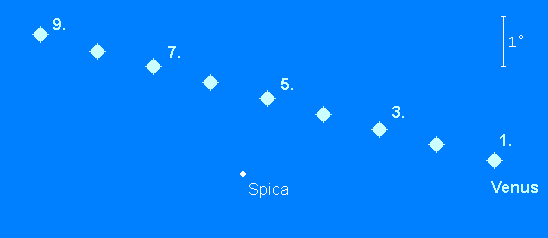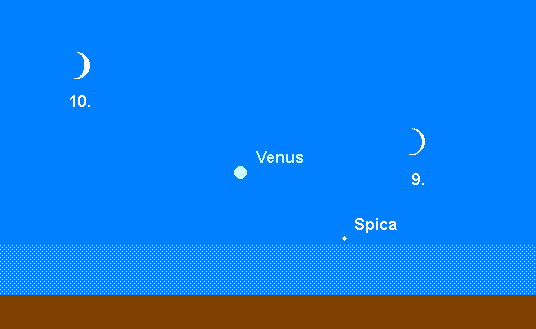 kann weiterhin nur in der Abenddämmerung tief über dem WSW-Horizont aufgefunden werden. Der –4.1m helle Planet wandert am 5. September 1.7° nördlich an Spica, dem Hauptstern des Sternbilds Jungfrau, vorüber. Diese Konjunktion dürfte nur im Fernglas erkennbar sein. Am 9. September findet man die schmale Mondsichel 7° rechts der Venus. Ins Sternbild Waage tritt der Planet am 18. September. Der Venusuntergang verlagert sich im Monatsverlauf von 21:15 MESZ auf 20:15 MESZ. Das Venusscheibchen vergrößert sich im Laufe des Monats von 15“ auf 18“ und ist etwa zu 65% beleuchtet. Allerdings macht die geringe Horizonthöhe teleskopische Beobachtungen schwierig.