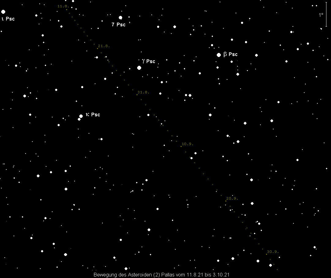 steht am 11. September im westlichen Teil des Sternbilds Fische in Opposition zur Sonne. Kleinplanet Nr. 2 erreicht an diesem Tag die Maximalhelligkeit von 8.5m, so dass sie im Fernglas erkennbar ist. Zu Monatsbeginn beträgt ihre Helligkeit 8.7m, am Monatsende 8.9m. Die beste Beobachtungszeit ergibt sich um Mitternacht.