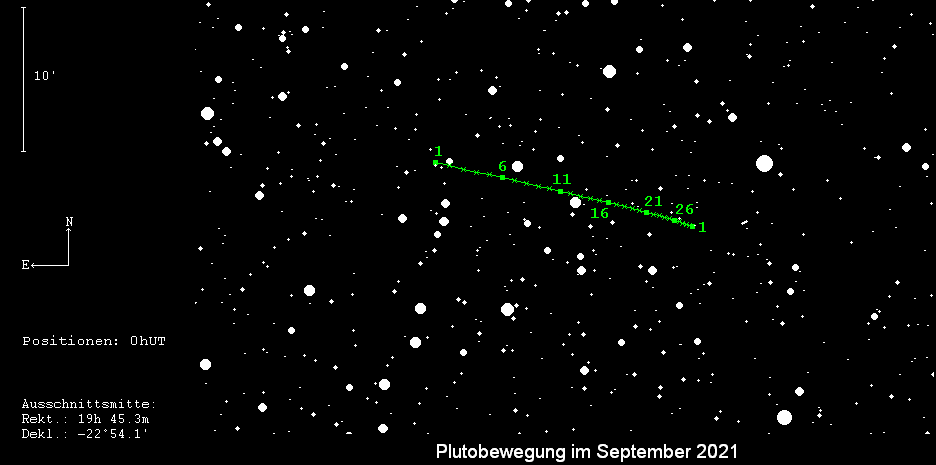 kann von Spezialisten mit größeren Instrumenten noch in den Abendstunden aufgesucht werden. Der nur 14.3m helle Zwergplanet wandert langsam rechtläufig durch den östlichen Teil des Sternbilds Schütze und nähert sich seinem Stillstand.