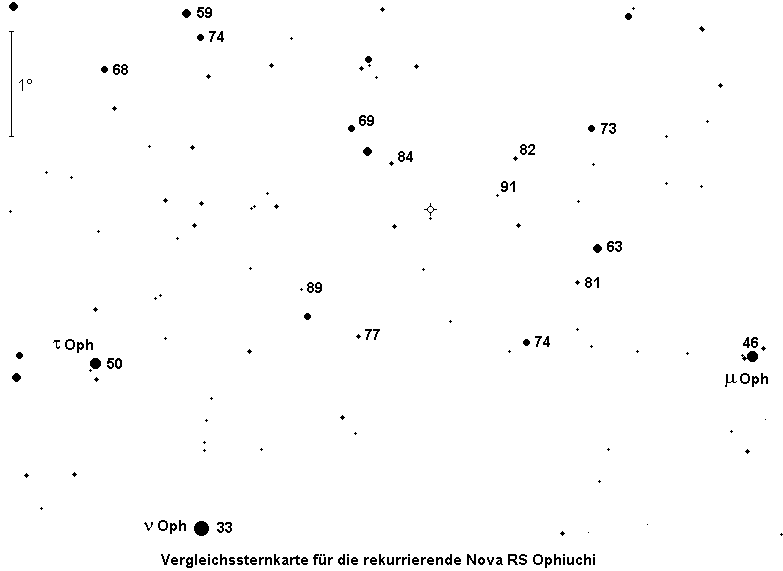 Die rekurrierende Nova RS Ophiuchi ist ein weiteres Mal explodiert. Sie erreichte am Abend des 8. August eine Maximalhelligkeit von 5.0m! Die Helligkeitsentwickltung rekurrierender Novae ist erfolgt extrem rasch. Daher sollte umgehend mit der Beobachtung begonnen werden. Das Sternbild Schlangenträger kann die gesamte Nacht über beobachtet werden. Details finden sich in der AVKa-Schnellmitteilung Nr. 107.