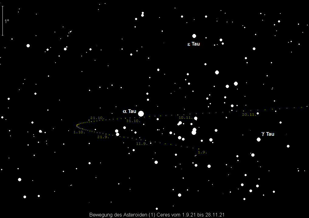 steht am 27. November in Opposition zur Sonne. Der zu Monatsbeginn erst 7.6m helle Kleinplanet Nr. 1 erreicht in dieser Nacht seine maximale Helligkeit von 7.0m. Ceres bewegt sich rückläufig durch das Sternbild Stier. Am 3. November passiert sie Aldebaran in nur 0.1° südlichem Abstand und läuft in den Folgetagen durch den Sternhaufen der Hyaden. Die beste Beobachtungszeit verlagert sich von 2:30 MEZ auf 0:15 MEZ, doch kann sie bereits am späteren Abendhimmel aufgefunden werden.