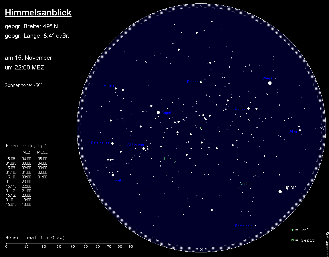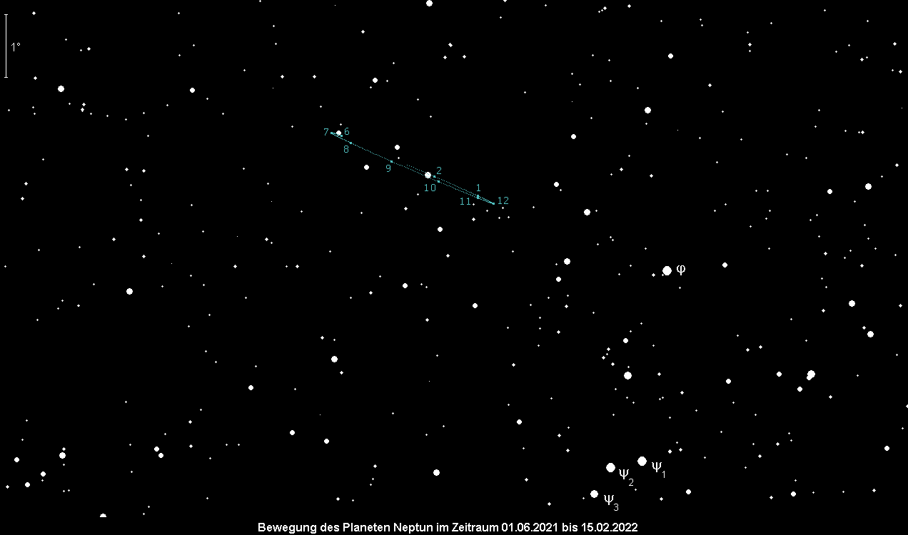 wird am 1. Dezember stationär und bewegt sich anschließend rechtläufig durch das Sternbild Wassermann. Im Fernglas ist der 7.8m helle Planet leidlich gut erkennbar, steht allerdings leider weitab markanter Sterne. In den Tagen um den 13. November wird der Mond eine Beobachtung stark behindern. Im Teleskop zeigt Neptun ein 2.4“ großes Scheibchen, das ab etwa 200x sicher erkennbar wird. Spezialisten können versuchen, den größten Mond Triton (13.4m hell) neben Neptun zu erkennen. Er bewegt sich nie mehr als 16“ von dem Planeten weg. Neptuns Kulmination verlagert sich von 21:00 MEZ auf 19:00 MEZ, seine Untergänge von 2:45 MEZ auf 0:45 MEZ, wobei Neptun zwei Stunden zuvor im Horizontdunst unsichtbar wird.
