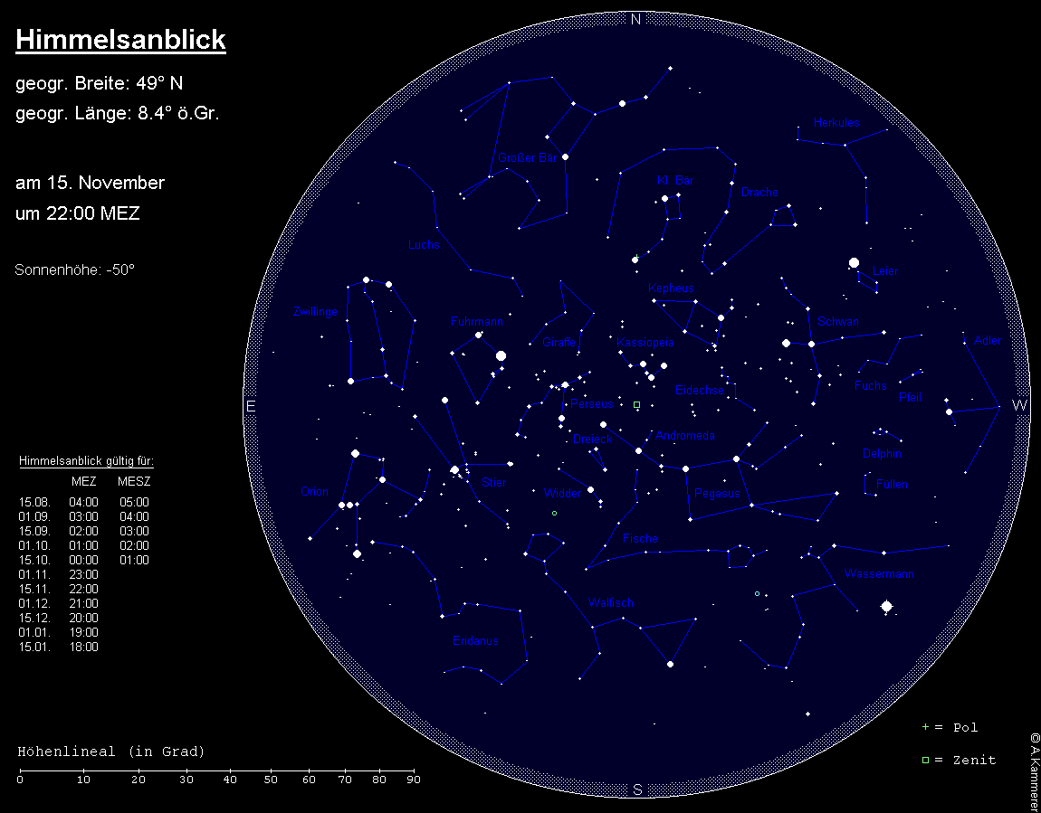 Im Süden kulminiert das große Sternbild Walfisch, von dem nur der südliche Stern Diphda und der Kopf auffälliger sind. 0berhalb des Walfischs stehen die Sternbilder Widder und Dreieck.